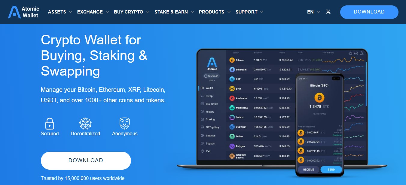Atomic Wallet is a non-custodial, decentralised wallet that gives users full control over their digital assets while offering a beginner-friendly interface. It supports over 1,000 cryptocurrencies across multiple blockchains, including Bitcoin, Ethereum, Solana, and BNB Chain. One of its standout features is Atomic Swaps, which allow users to exchange selected cryptocurrencies directly from the wallet without relying on centralised exchanges. The wallet uses strong encryption and local key storage, meaning private keys and backup phrases never leave the user’s device. It also includes 24/7 live support, in-app staking for over 20 assets, and customisable network fees, giving users control over transaction costs and speeds. There are no account or maintenance fees, though network fees apply based on blockchain activity.