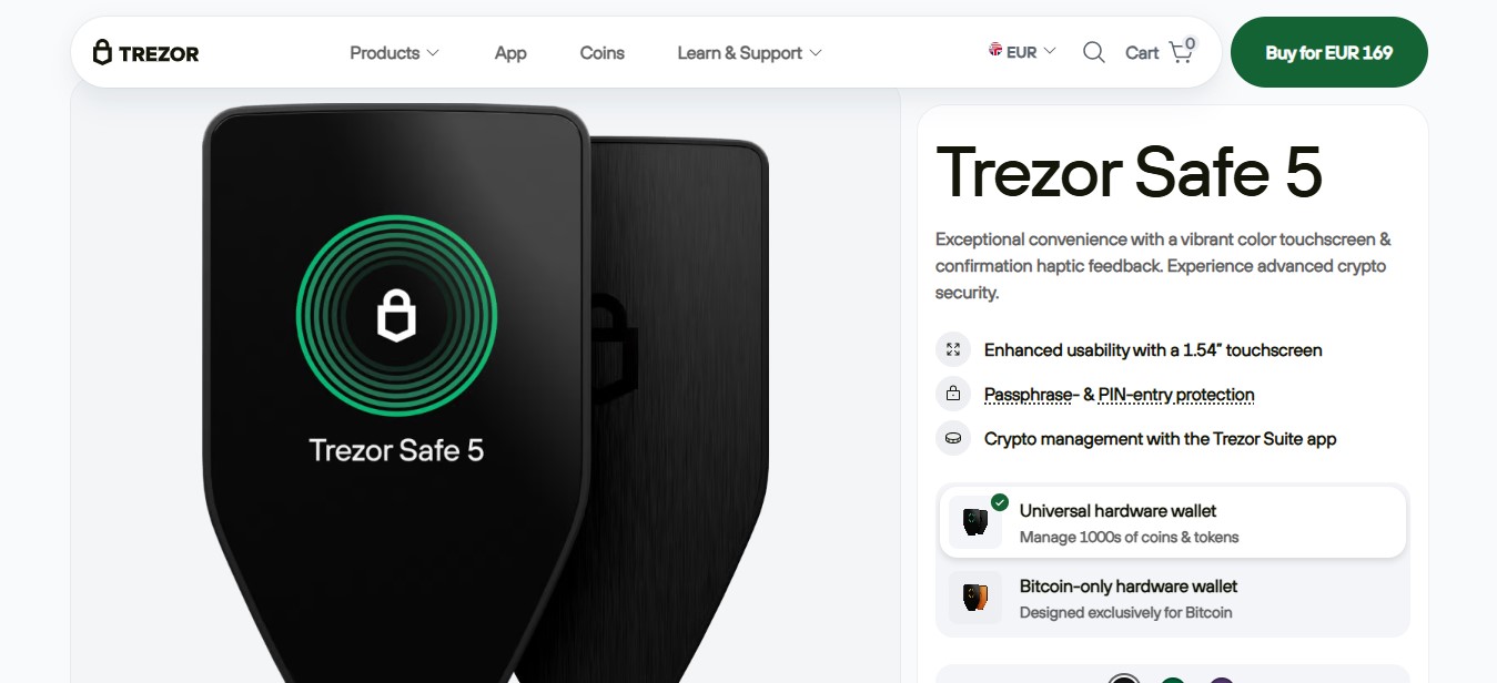 The Trezor Safe 5 is the latest generation of Trezor’s flagship hardware wallets with an advanced EAL6+ certified Secure Element chip, open-source firmware, and colour touchscreen display. This simplifies navigation while maintaining solid protection against phishing and malware attacks. Supporting over 9,000 cryptocurrencies, including Bitcoin, Ethereum, Solana, and ERC-20 tokens, it offers broad compatibility for diverse portfolios. Transactions are verified directly on the device, ensuring private keys never leave the hardware, making it virtually immune to online threats.