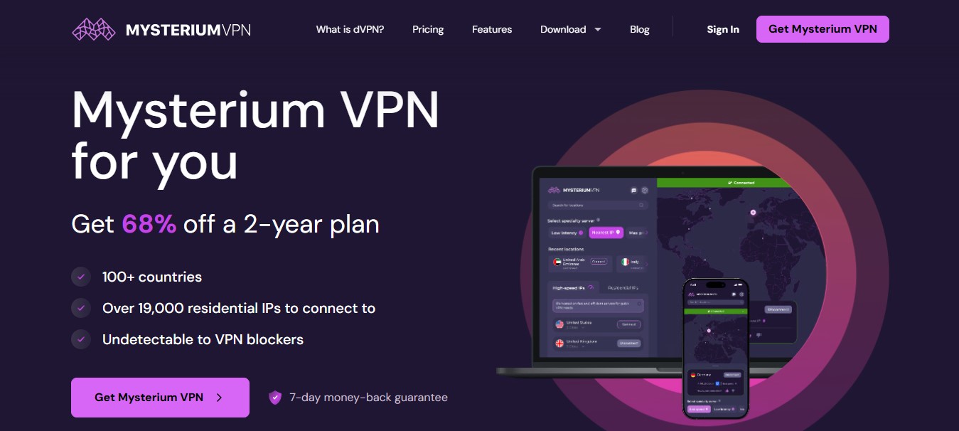 Mysterium VPN is a decentralised, peer-to-peer virtual private network developed to improve online privacy through a distributed network of residential IPs rather than traditional data center servers. This architecture makes it harder for websites and platforms to detect or block VPN traffic, offering traders a more stable and discreet connection when accessing Hyperliquid. The service employs the WireGuard encryption protocol, supports DNS leak protection, and maintains a strict no-logs policy, ensuring that users’ online activity and identity are fully protected.