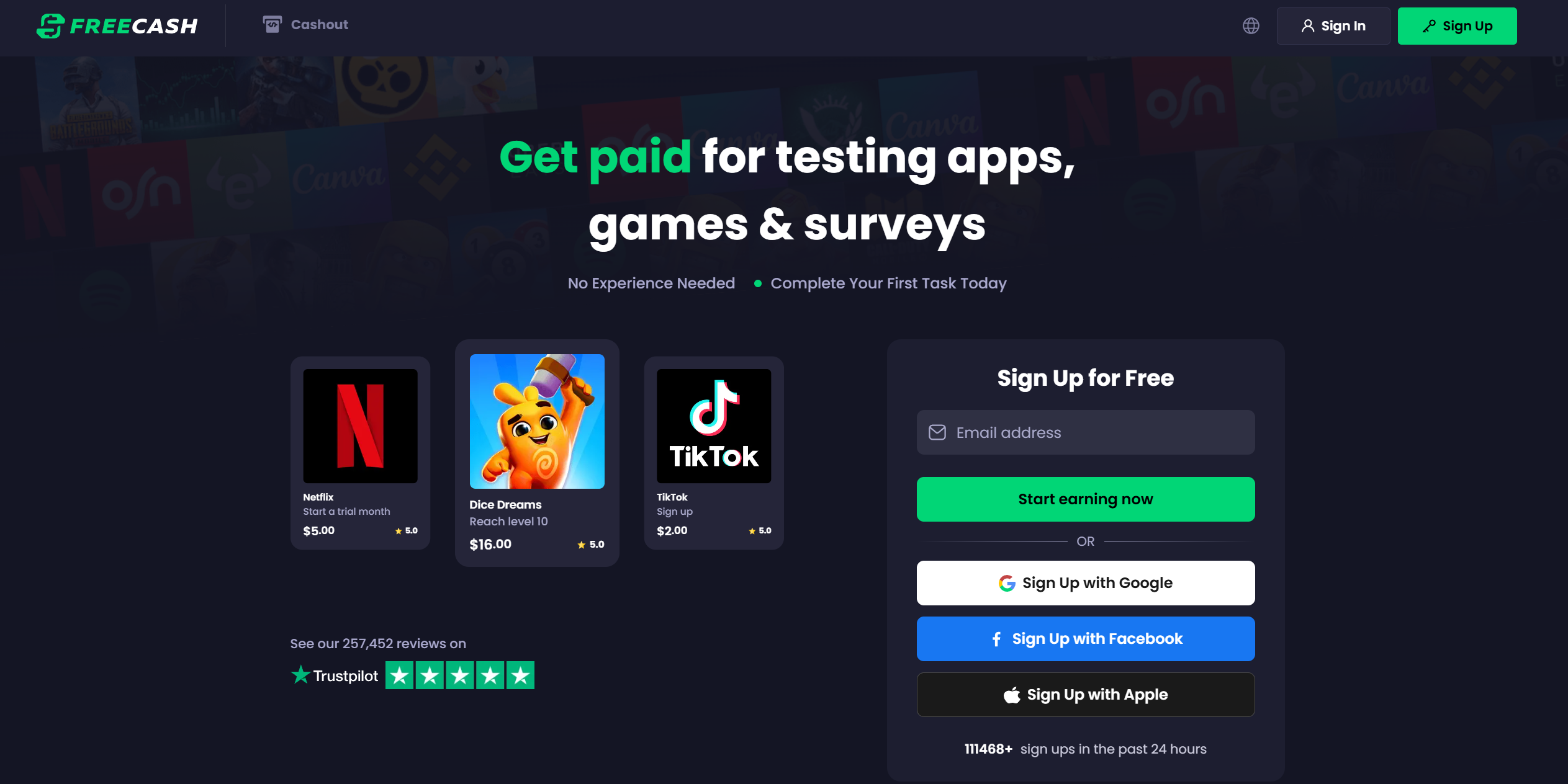 Freecash is a task-based earning platform that allows users to earn rewards without any upfront investment. Instead of traditional gameplay, users complete simple online activities such as filling out surveys, downloading apps, playing games, watching videos, or testing digital products offered by advertising partners.